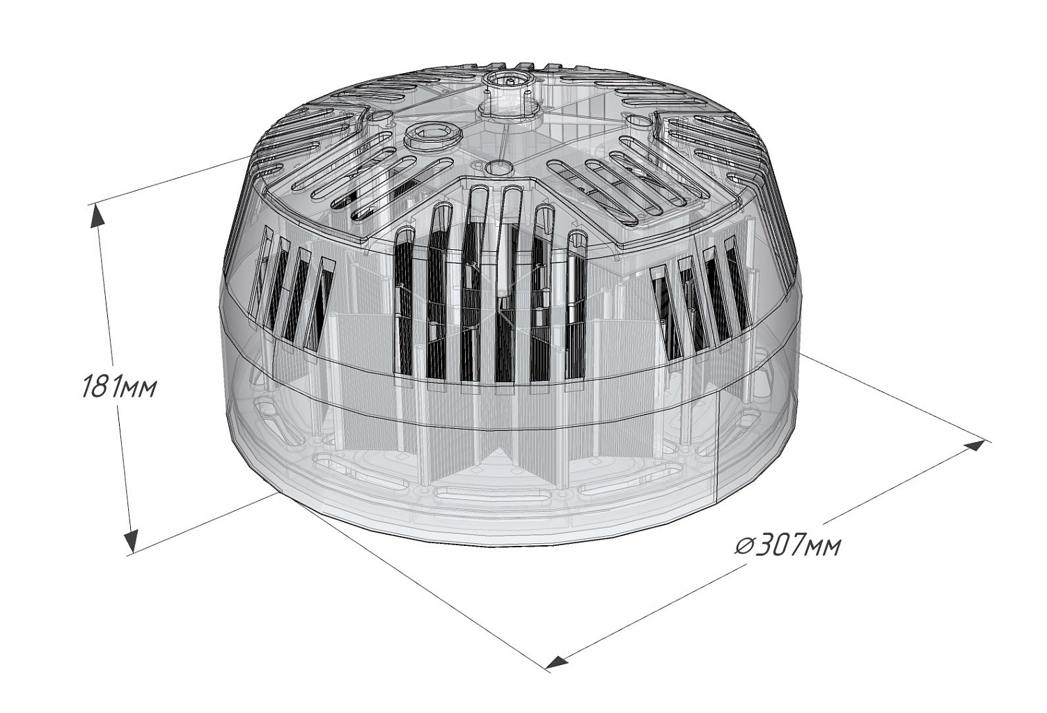 Промышленный светильник типа колокол: LED 5050 (до 240лм/Вт), источник питания с защитами от 380В, грозы, импульсов до 4кВ, уникальный легкий корпус из алюминия и поликарбоната, оптика Г90 / К60. Запатентованное решение по классу Изобретение.